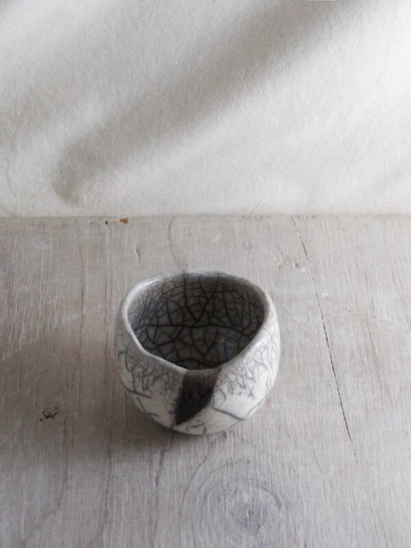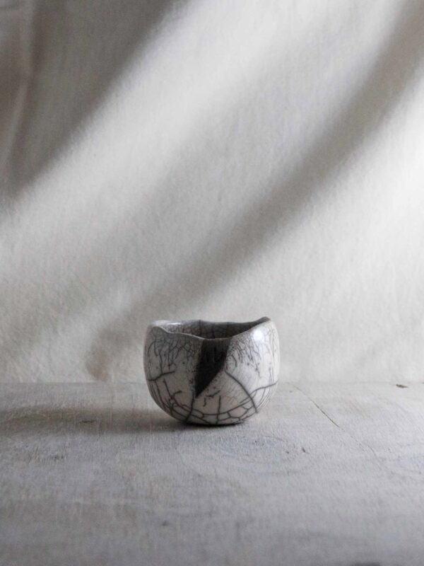Ciotolina raku ornamentale realizzata interamente a mano con argilla bianca semirefrattaria e biscottata alla temperatura di 1000° C; rivestita con cristallina trasparente apiombica e cotta con la tecnica raku.
