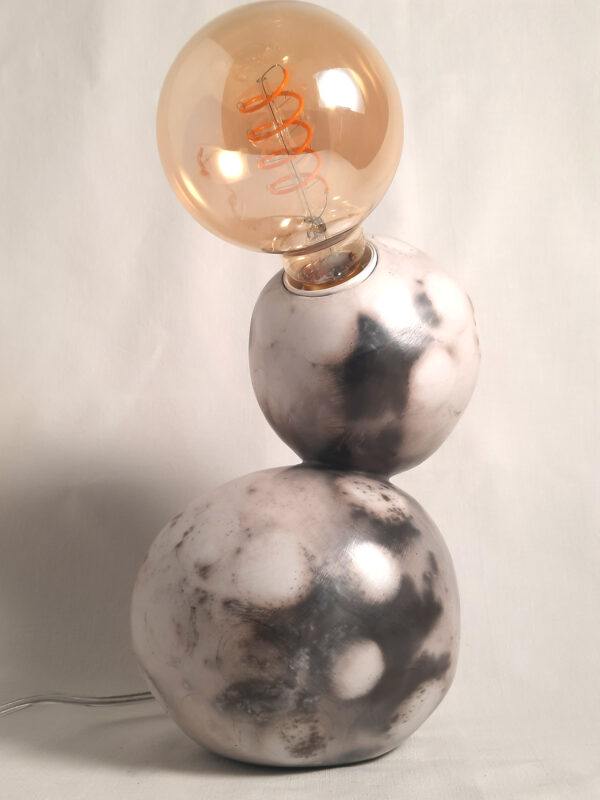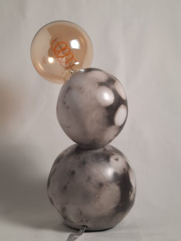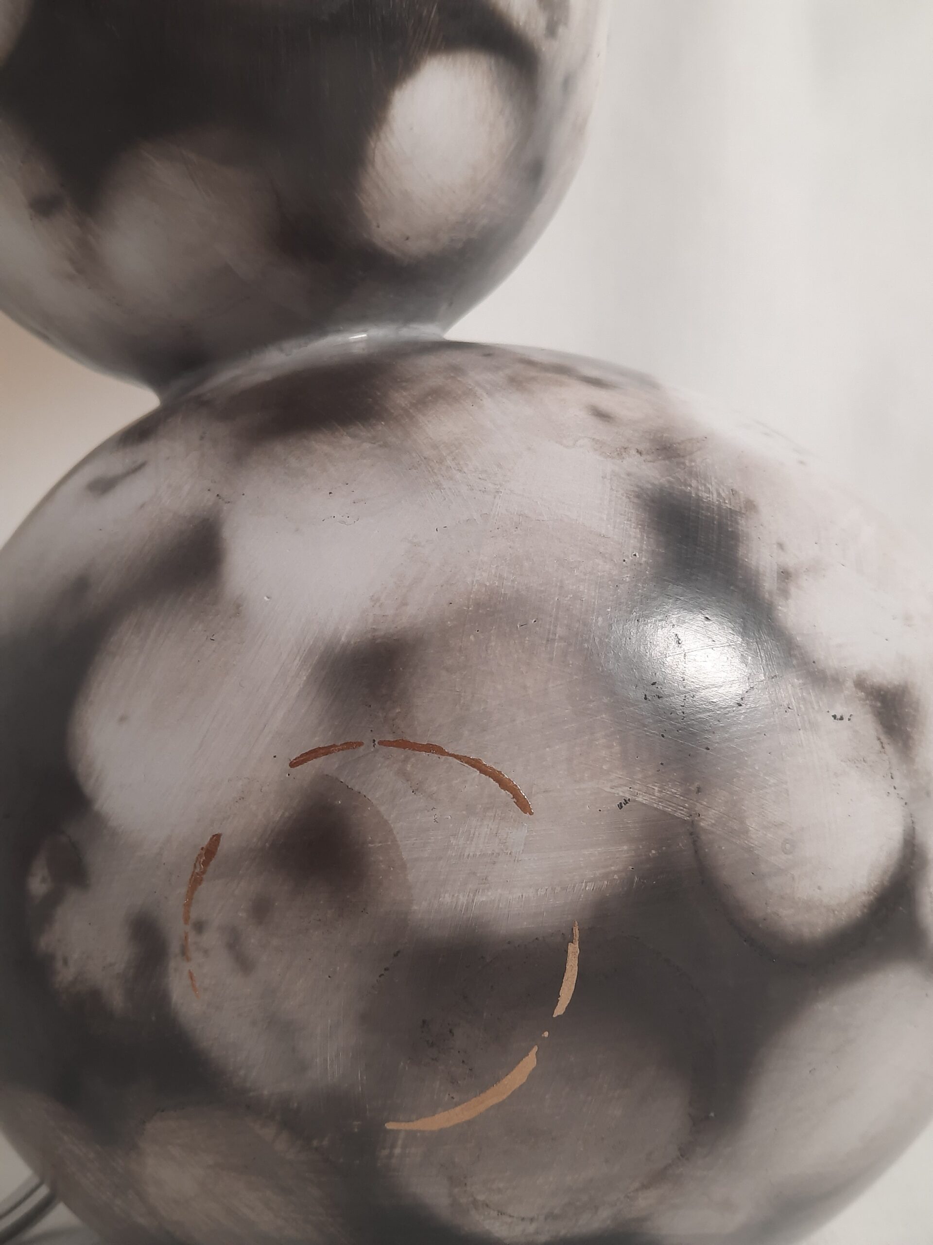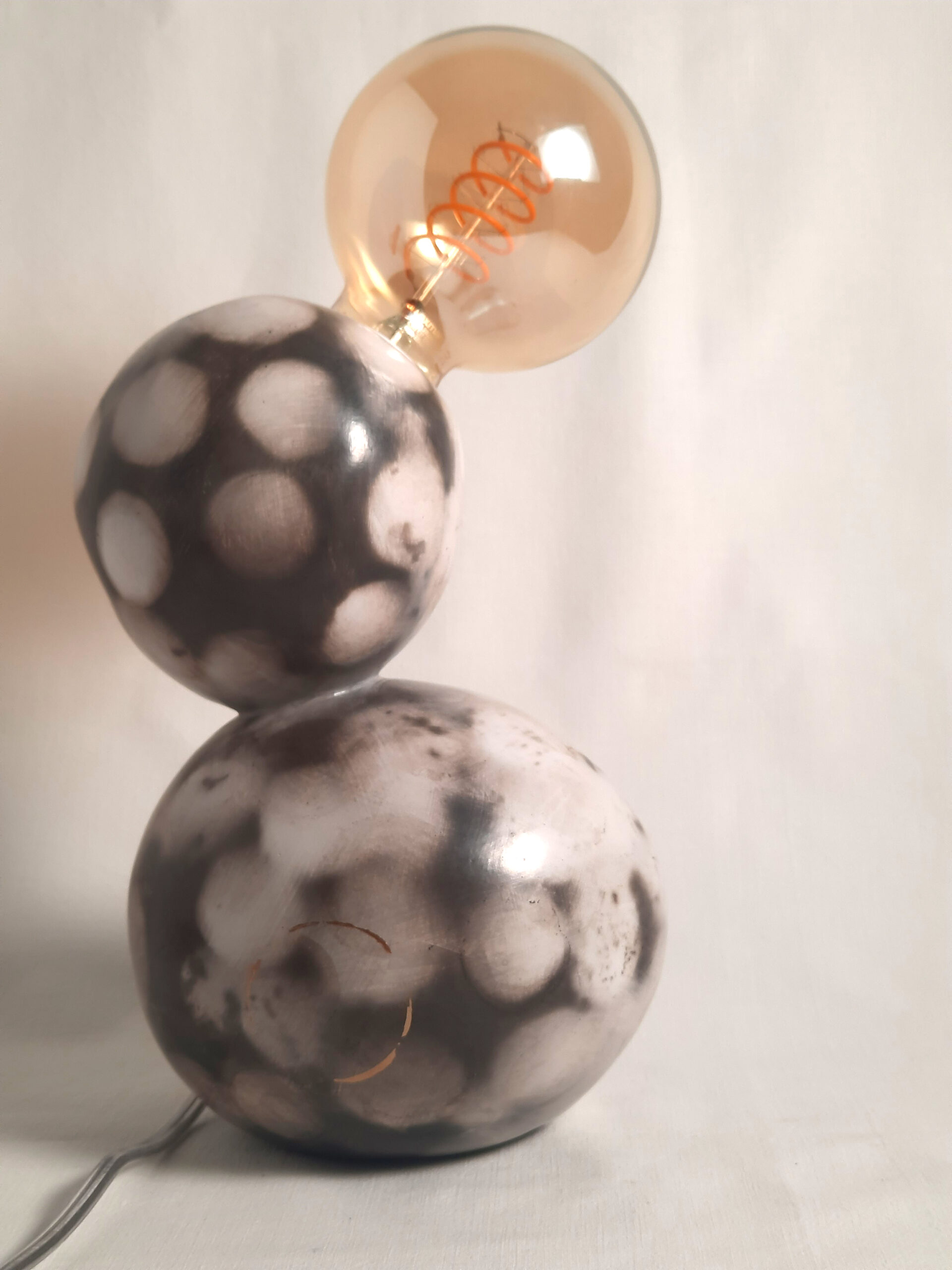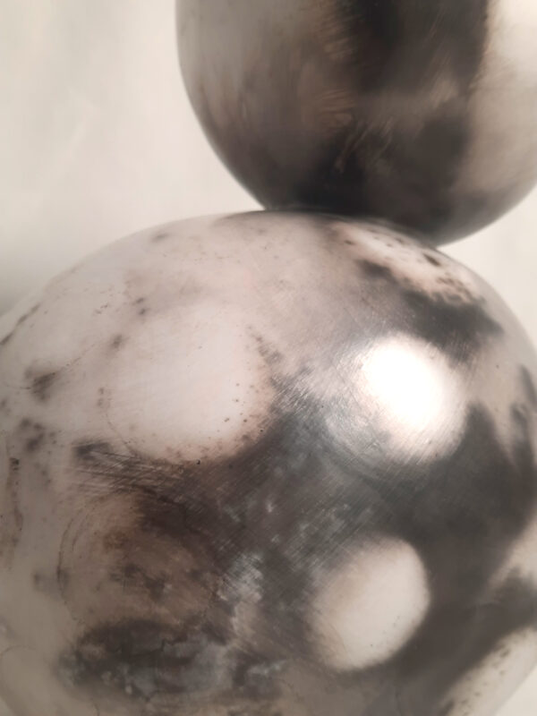 Si tratta di un pezzo unico eseguito con le tecniche del pizzicato e colombino utilizzando argilla bianca semirefrattaria. Nella fase che precede l’essiccazione, quella che in gergo si chiama durezza cuoio, il pezzo è stato lisciato con apposite spatole, quindi perfettamente levigato con una stecca d’agata. Rivestito infine con tre strati di terra sigillata per ottenere un aspetto vellutato, è stato biscottato alla temperatura di 1000° C. Deve la particolare colorazione finale alla tecnica saggar firing.