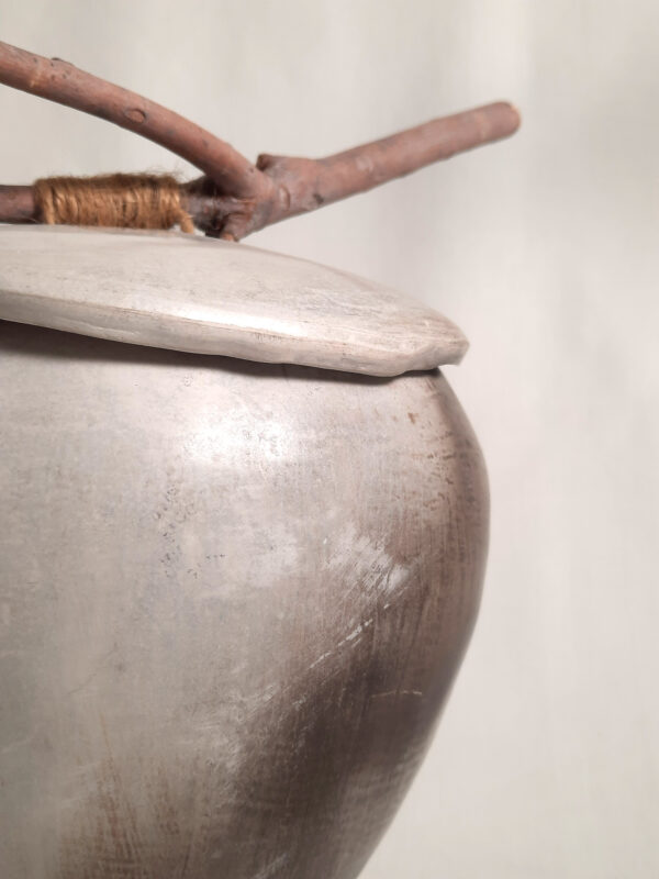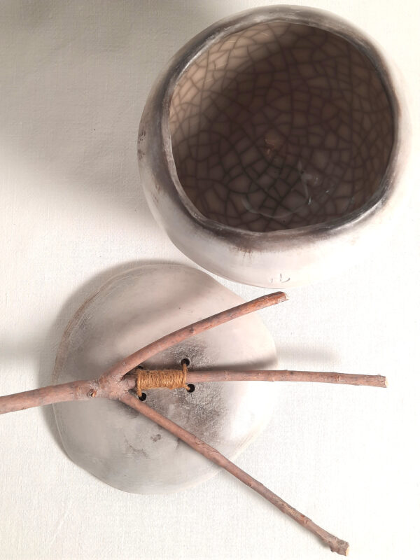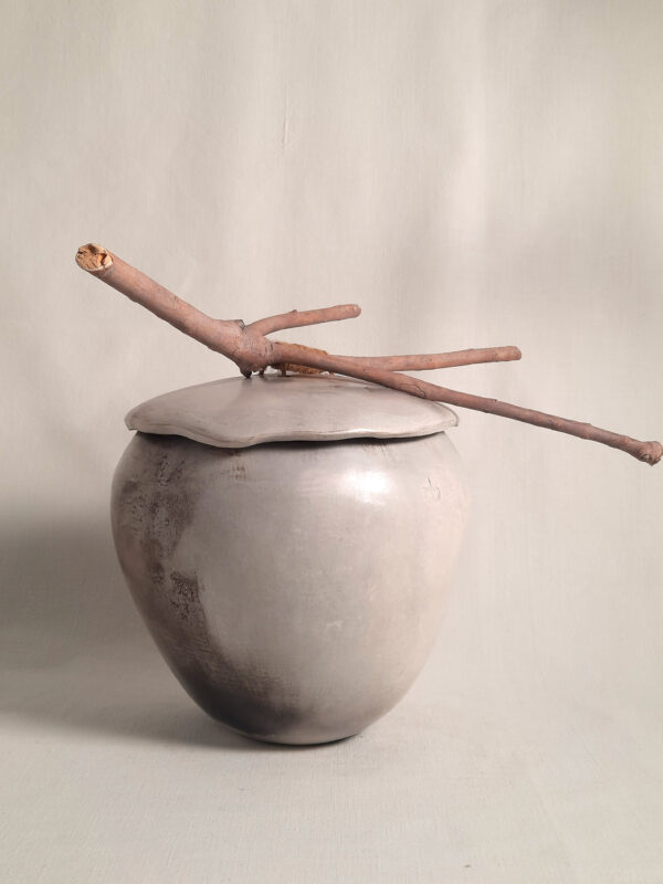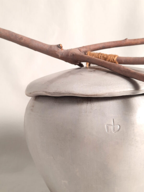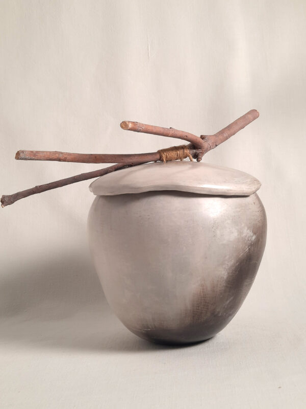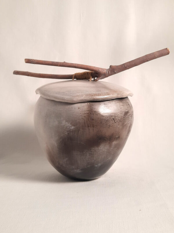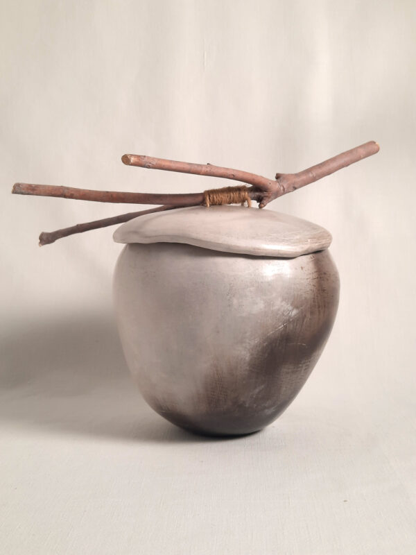 Si tratta di un pezzo unico eseguito al tornio utilizzando argilla bianca semirefrattaria. Nella fase che precede l’essiccazione, quella che in gergo si chiama durezza cuoio, il pezzo è stato lisciato con apposite spatole, quindi perfettamente levigato con una stecca d’agata. Rivestito infine con tre strati di terra sigillata per ottenere un aspetto vellutato, è stato biscottato alla temperatura di 1000° C. Invetriato internamente ha eseguito la seconda cottura a 960°C. Deve la particolare colorazione finale alla tecnica saggar firing e la singolare iridescenza all’utilizzo di miche miscelate alla terra sigillata. È possibile riconoscere sulla superficie del coperchio l’impronta di un fiore d’orchidea. La cottura in riduzione d’ossigeno ha gradevolmente evidenziato il craquelé all’interno.