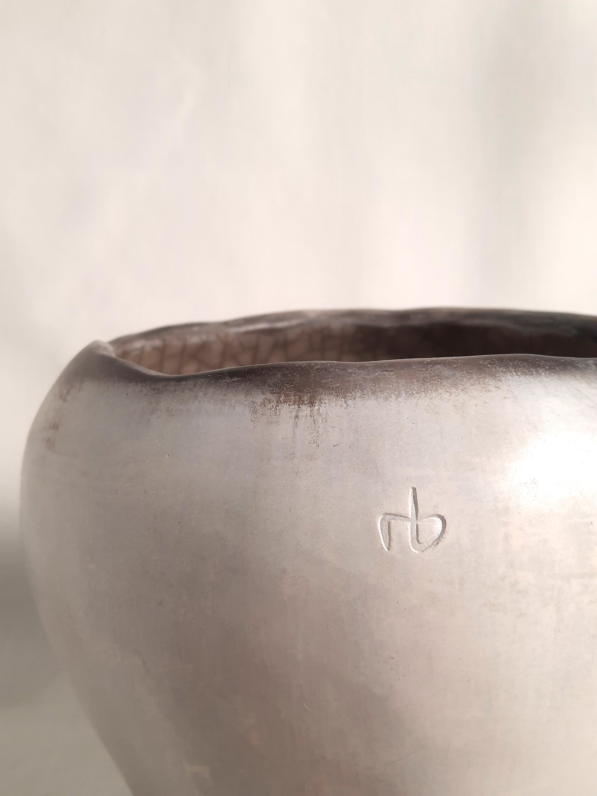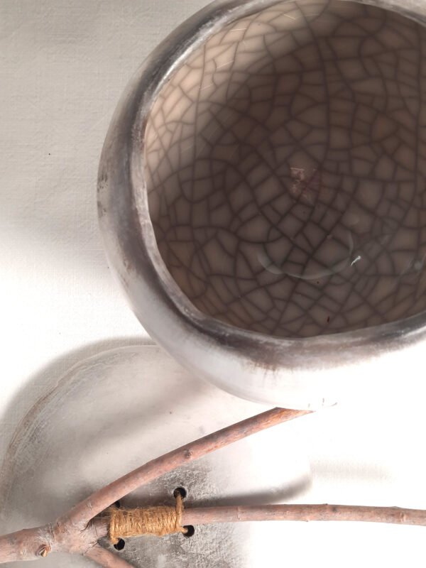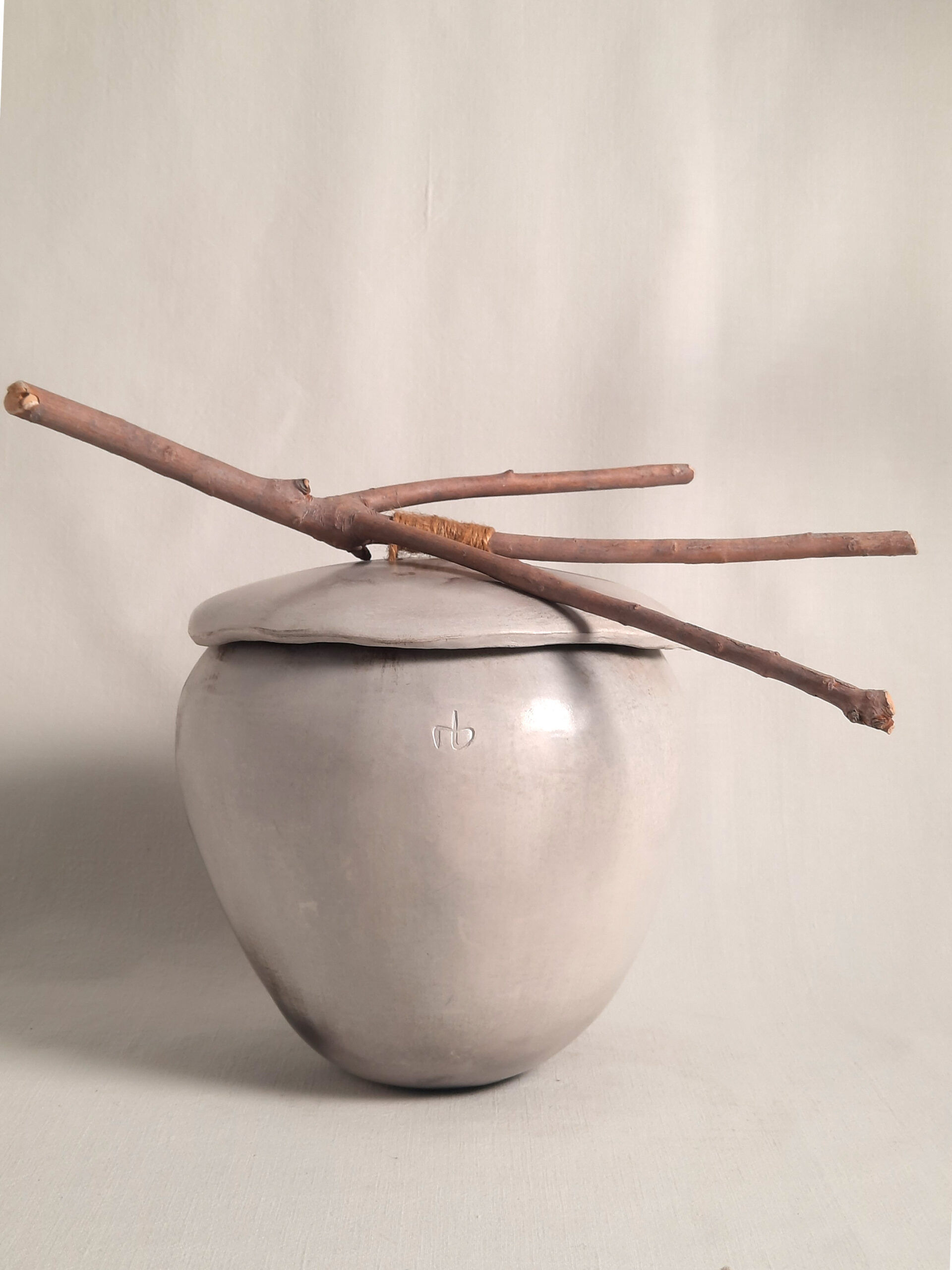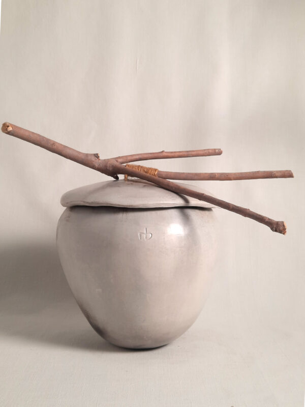 Si tratta di un pezzo unico eseguito al tornio utilizzando argilla bianca semirefrattaria. Nella fase che precede l’essiccazione, quella che in gergo si chiama durezza cuoio, il pezzo è stato lisciato con apposite spatole, quindi perfettamente levigato con una stecca d’agata. Rivestito infine con tre strati di terra sigillata per ottenere un aspetto vellutato, è stato biscottato alla temperatura di 1000° C. Invetriato internamente ha eseguito la seconda cottura a 960°C. Deve la particolare colorazione finale alla tecnica saggar firing e la singolare iridescenza all’utilizzo di miche miscelate alla terra sigillata. È possibile riconoscere sulla superficie del coperchio l’impronta di un fiore d’orchidea. La cottura in riduzione d’ossigeno ha gradevolmente evidenziato il craquelé all’interno.