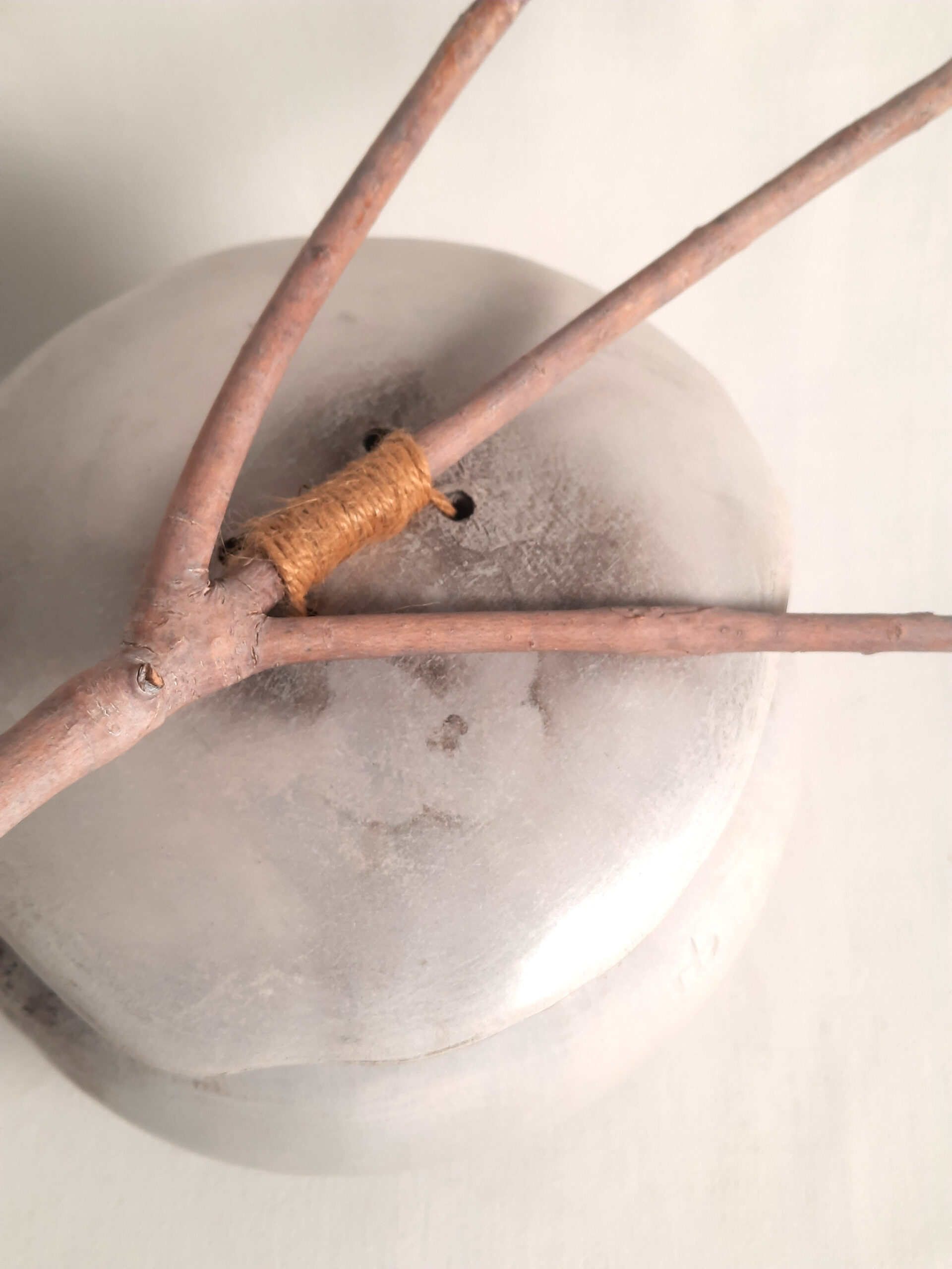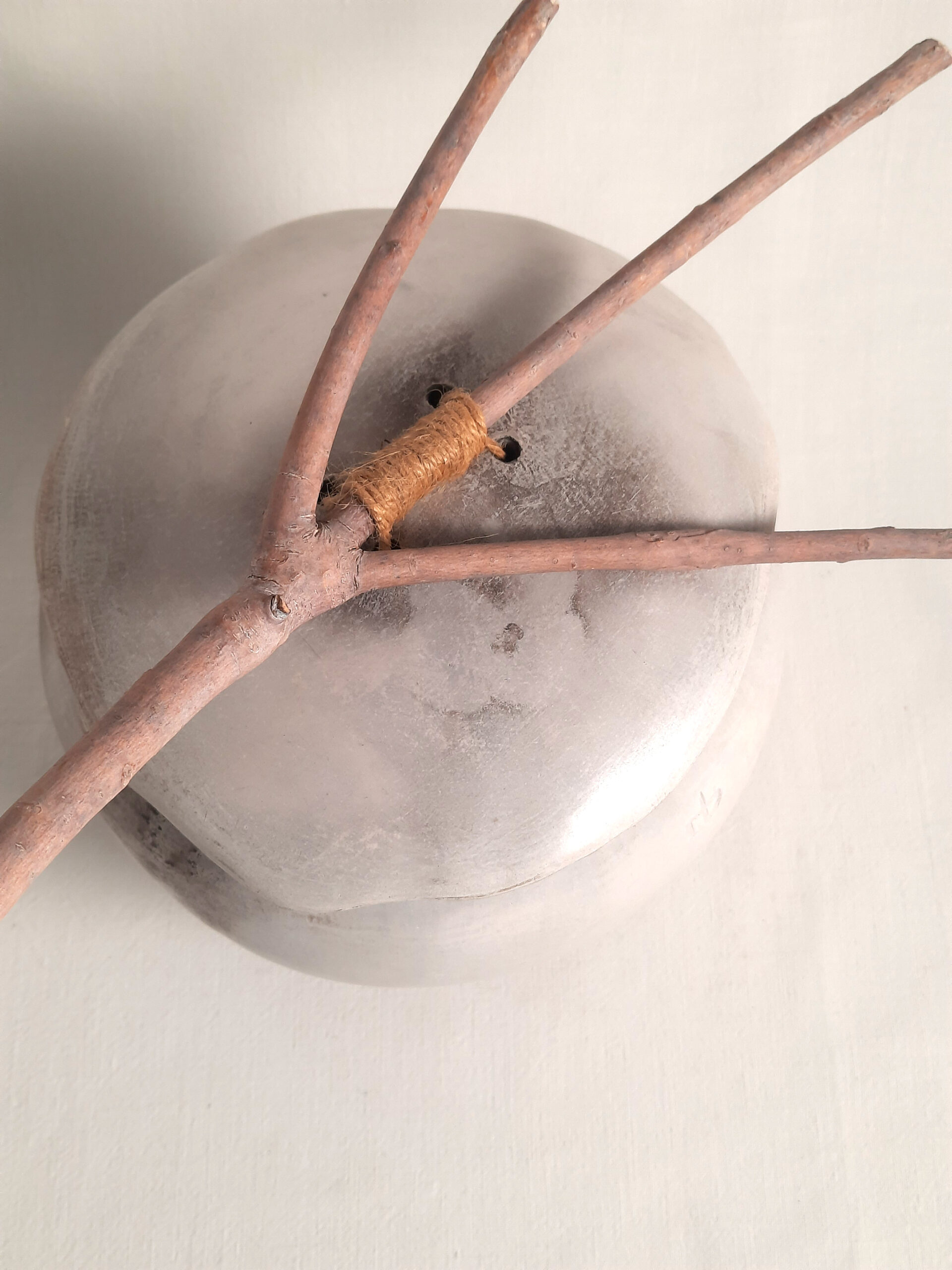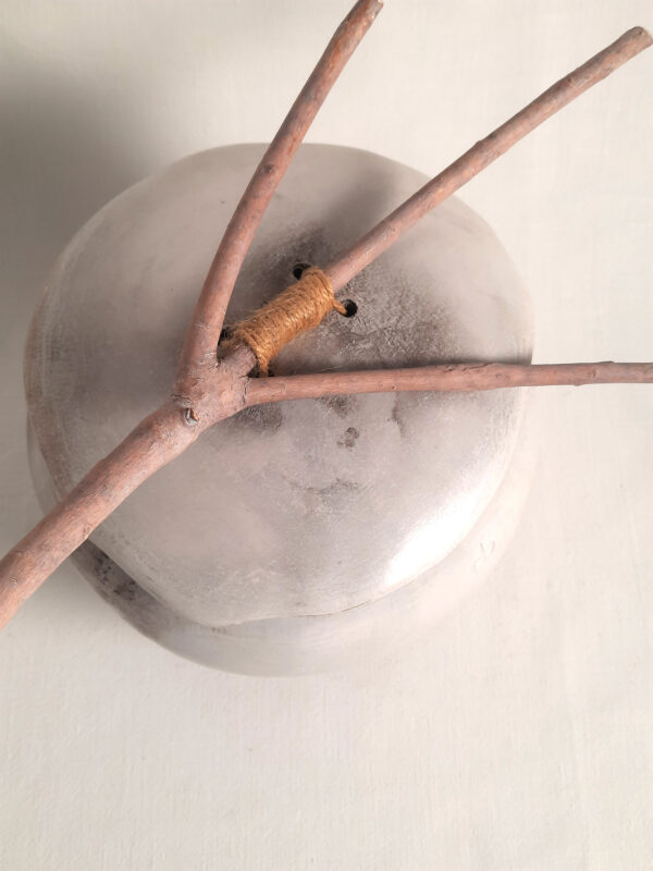 Finitura liscia lucida, manico in legno fissato al coperchio tramite uno spago.
